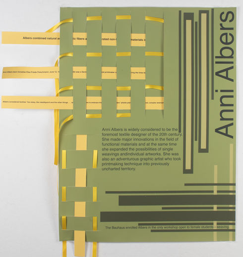 This poster connect weaver Anni Albers designs and color scheme into a interactive poster. Ones is able to weave with the strands of paper and ribbon in and out of the poster. One the stand of paper and throughout the poster, one is able to find information about Anni's life a a designer and weaver.